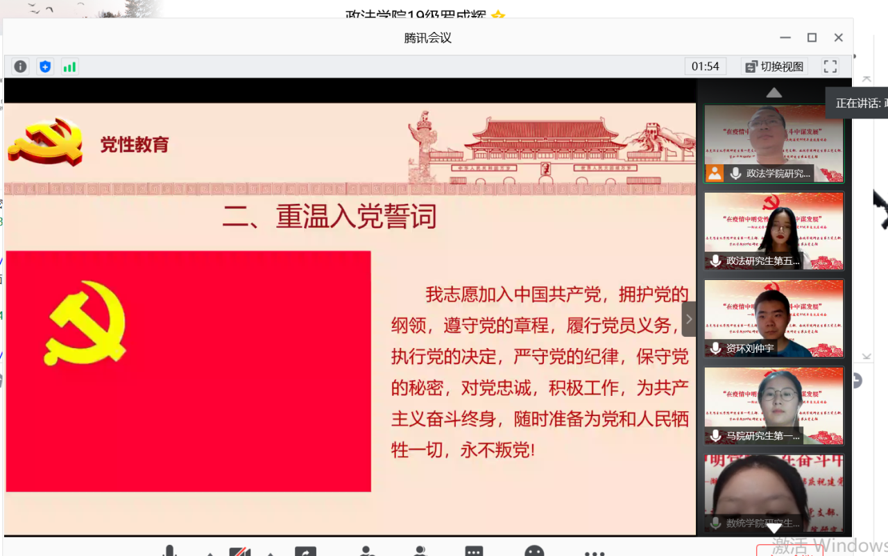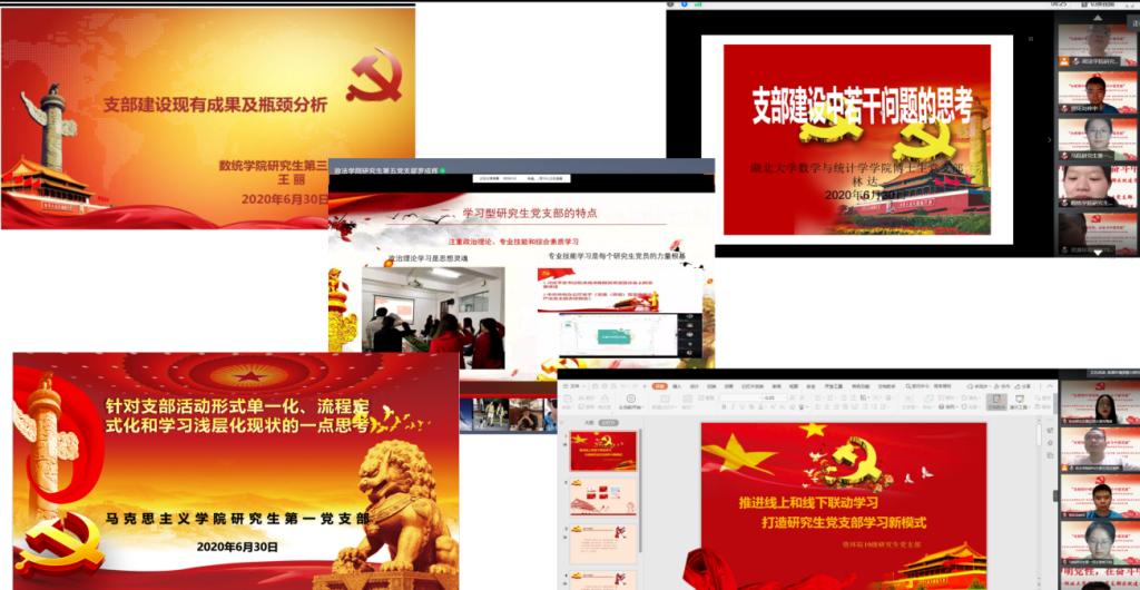(通訊員 王陳希)6月30日,為慶祝中國(guó)共產(chǎn)黨成立99周年,進(jìn)一步凝聚不忘初心跟黨走、牢記使命譜新篇的奮斗精神,湖北大學(xué)黨委研究生工作部組織研究生黨支部開(kāi)展“在疫情中明黨性,在奮斗中謀發(fā)展”線(xiàn)上交流座談會(huì),數(shù)統(tǒng)學(xué)院、馬克思主義學(xué)院、政法學(xué)院和資環(huán)學(xué)院的五個(gè)研究生黨支部支委會(huì)成員參與交流,湖北大學(xué)黨委研究生工作部副部長(zhǎng)葉秀娟老師出席座談會(huì)。羅成輝同志主持座談會(huì)。