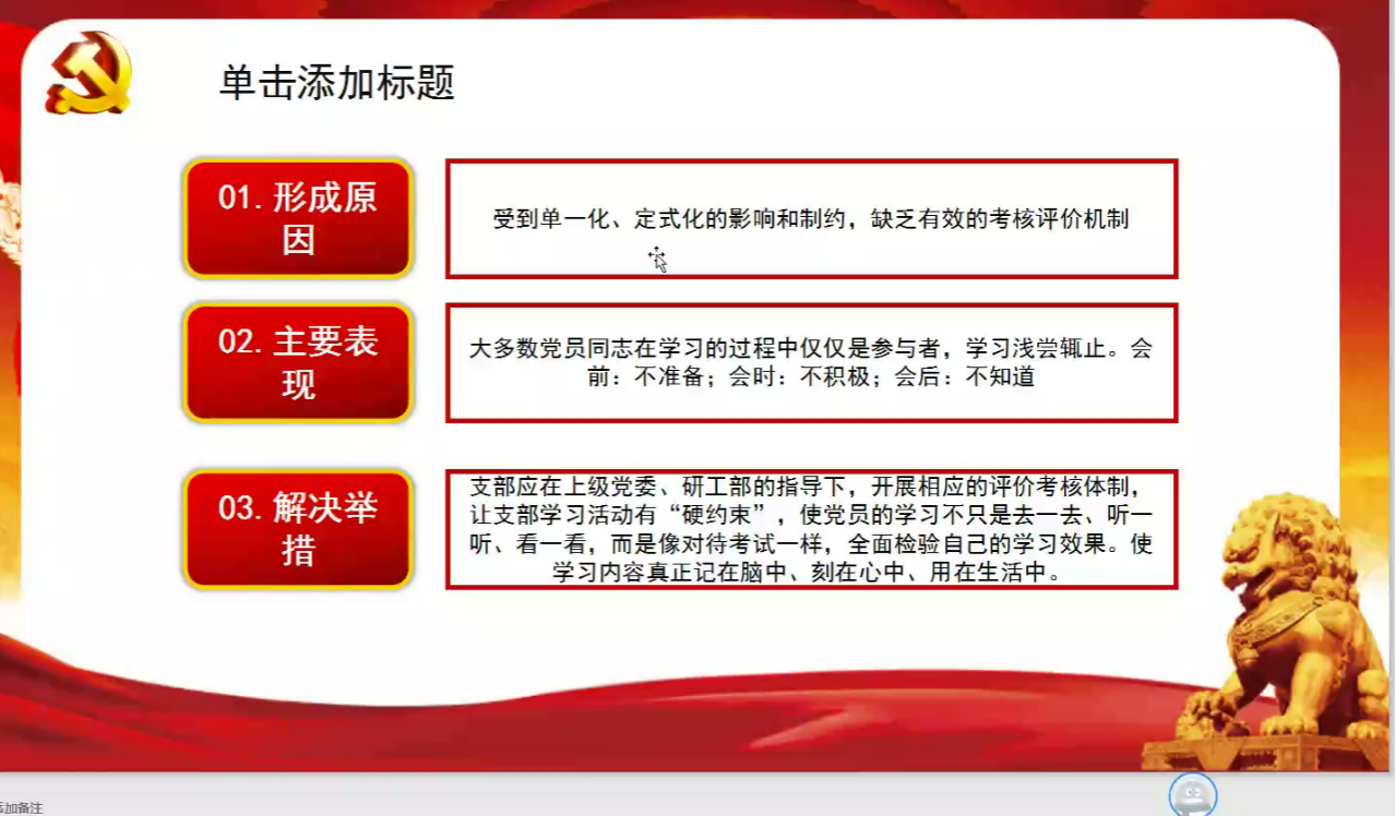 參會(huì)人員圍繞問(wèn)題展開(kāi)激烈討論,并提出了若干建議。劉海燕同志認(rèn)為支部開(kāi)展活動(dòng)要理論學(xué)習(xí)與專(zhuān)業(yè)學(xué)習(xí)并重,采取1+1模式開(kāi)展主題黨日活動(dòng);羅成輝同志建議模塊化開(kāi)展理論學(xué)習(xí),將學(xué)習(xí)內(nèi)容分包給支部黨員;唐熙隆同志認(rèn)為要每年對(duì)黨員采取檢測(cè);其他參會(huì)同志分別就活動(dòng)經(jīng)費(fèi)問(wèn)題、黨員培養(yǎng)問(wèn)題提出了很好的建議。