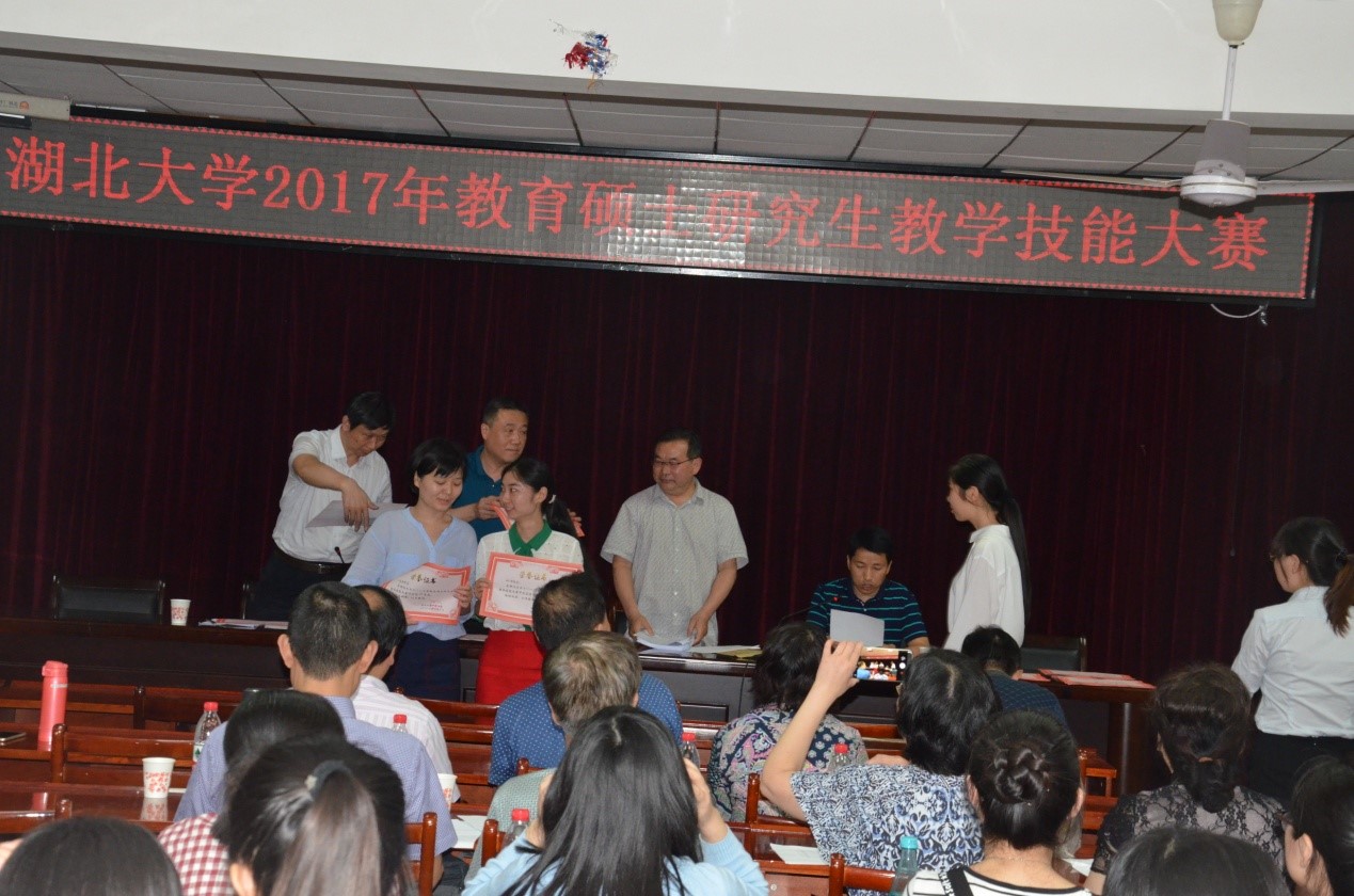當(dāng)天下午四點(diǎn),湖北大學(xué)2017年全日制教育碩士研究生教學(xué)技能大賽教學(xué)點(diǎn)評(píng)與頒獎(jiǎng)典禮開(kāi)始。教育碩士專業(yè)學(xué)位教育中心負(fù)責(zé)人、大賽評(píng)委、帶隊(duì)老師、參賽學(xué)生等相關(guān)人員參加了頒獎(jiǎng)典禮。文科組專家評(píng)委李玉新組長(zhǎng)、理科組評(píng)委黃朝炎組長(zhǎng)、研究生院馮軍副處長(zhǎng)出席頒獎(jiǎng)儀式,并為獲獎(jiǎng)學(xué)生和單位頒獎(jiǎng)并發(fā)表講話。本次頒獎(jiǎng)典禮由教育碩士專業(yè)學(xué)位教育中心常務(wù)副主任、教育學(xué)院副院長(zhǎng)趙厚勰主持。