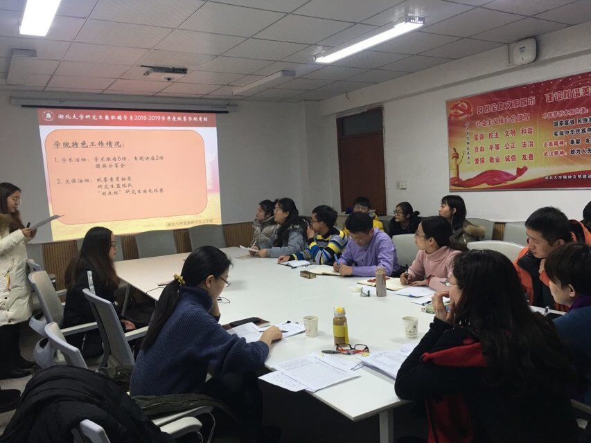 考評會現(xiàn)場,兼職輔導員重點圍繞學院研究生基本情況和學生干部隊伍建設情況;研究生思想政治教育、獎助評定、就業(yè)指導、安全教育以及宿舍管理等工作開展情況及成效;研究生黨建活動、學術科技活動等方面的特色工作;工作反思和下學期計劃四個方面開展述職。同學們匯報條理清晰,層次分明,內容詳實。其中,體育學院“研途三部曲入學系列講座”、商學院“學習進行時”、馬克思主義學院走進基層實地調研、材料科學與工程學院材料論壇、物理與電子科學學院跨學院活動“青春物語”和“演講比賽”、數(shù)學與統(tǒng)計學學院“師生籃球友誼賽”等特色活動和工作經驗受到評委的一致好評。
