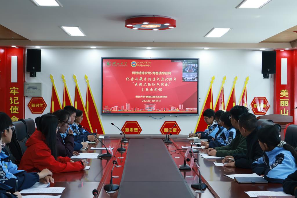 跨越山海,精神相承。2025年11月11日下午,湖北大學(xué)與西藏山南市東輝中學(xué)共聚云端,再度攜手,依托“青荷弘聲”博士宣講團(tuán)開(kāi)展了學(xué)習(xí)貫徹黨的二十屆四中全會(huì)精神暨“云端上的紅色傳承”主題團(tuán)課活動(dòng)。兩地師生通過(guò)視頻連線共學(xué)共議“兩路精神”與“老西藏精神”,深化情感共鳴,凝聚青春力量。