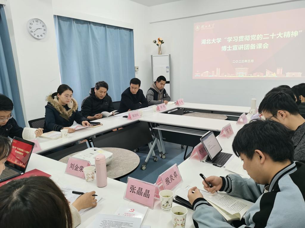 3月22日下午,“學(xué)習(xí)貫徹黨的二十大精神”博士宣講團(tuán)在行政樓636會議室召開集體備課會。博士宣講團(tuán)指導(dǎo)老師、馬克思主義學(xué)院教授郭勁松,研工部副部長李明出席。