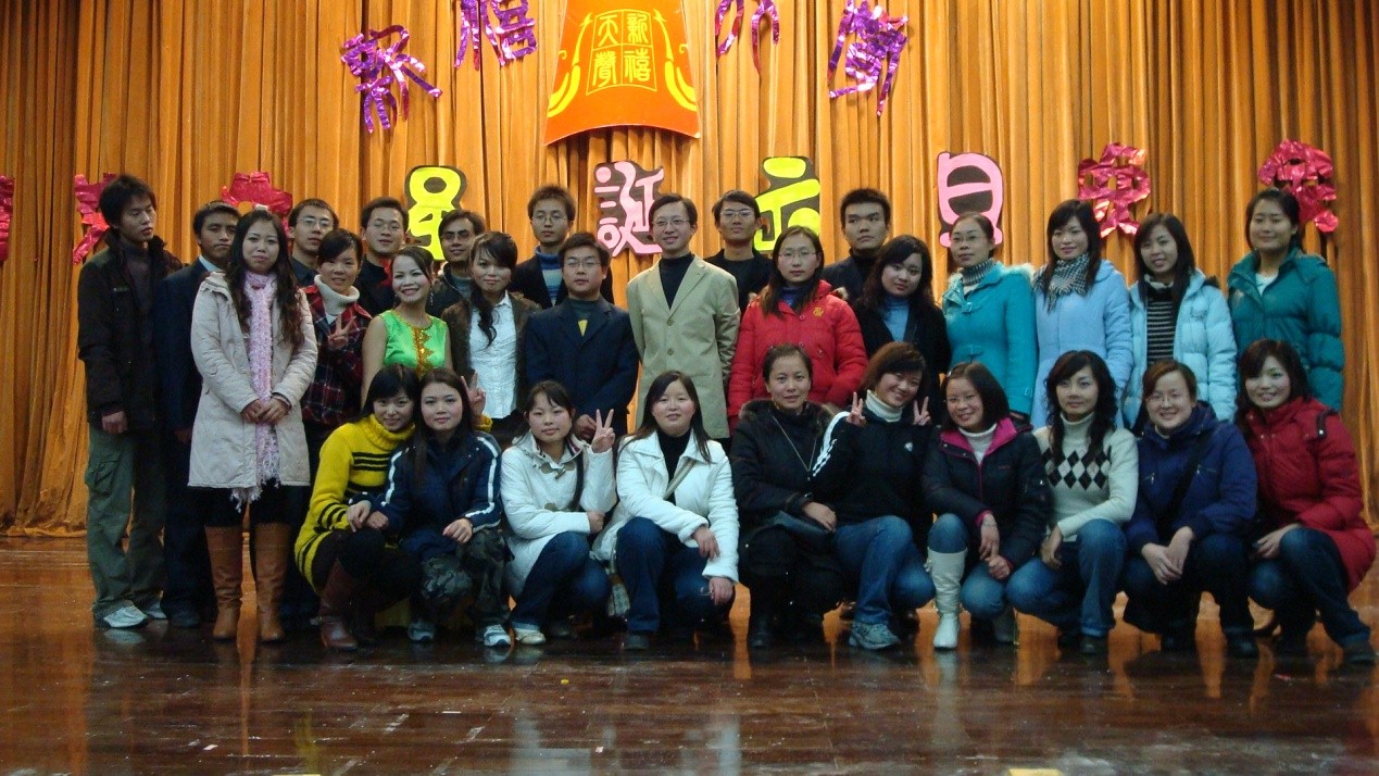 首屆“新禧天聲”圣誕、元旦聯(lián)歡晚會(huì)結(jié)束后,第十屆校研究生會(huì)成員在小禮堂舞臺(tái)上的合影(攝于2007年12月24日)。