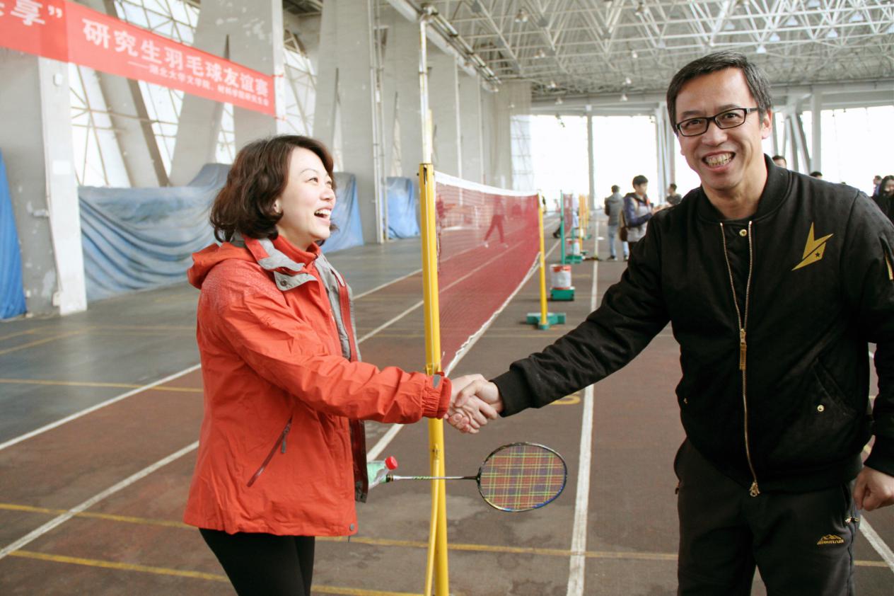最后,體育學院公體部主任張勝宣布本次“羽友杯”師生羽毛球賽團體賽正式開幕,葉秀娟副部長和張勝主任為本屆羽毛球賽開球。