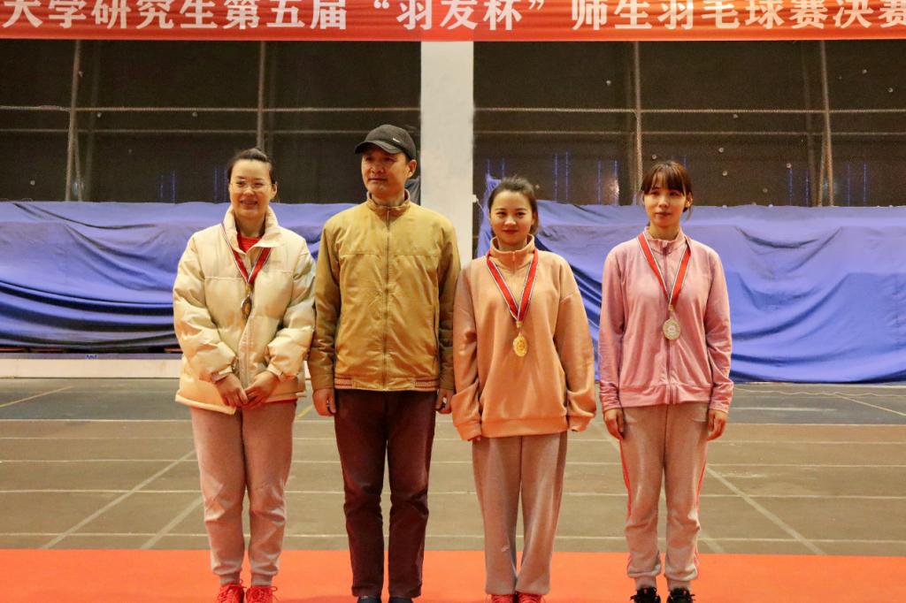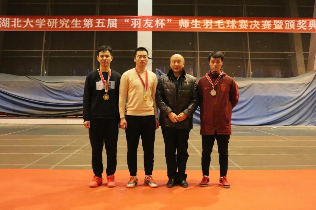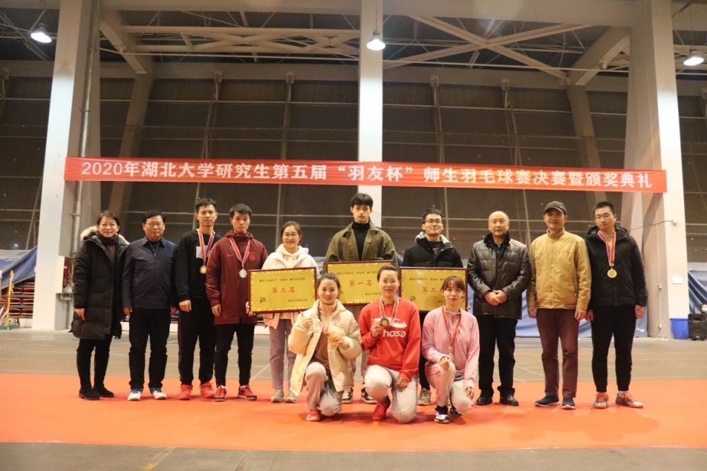 主持人宣布湖北大學(xué)第五屆研究生“羽友杯”師生羽毛球賽閉幕,頒獎嘉賓同獲獎選手及單位合影留念。